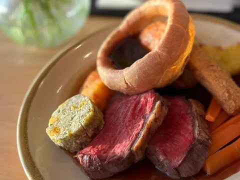 This is a 3-course traditional homemade Sunday lunch with a selection of meats, golden crispy roast potatoes, seasonal vegetables, real gravy and all the trimmings. Plus, a pint, glass of wine, or soft drink.