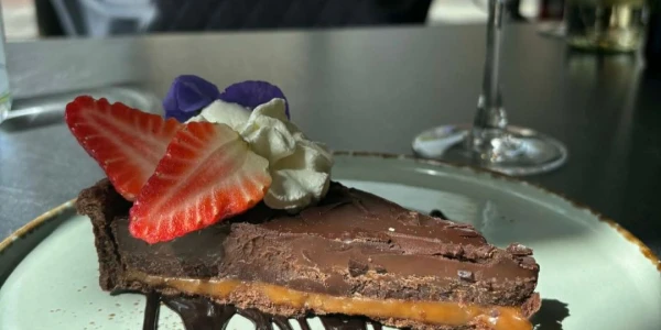 Chocolate lovers won’t be able to resist the chocolate tart, rich and decadent, served with fresh strawberries and cream.