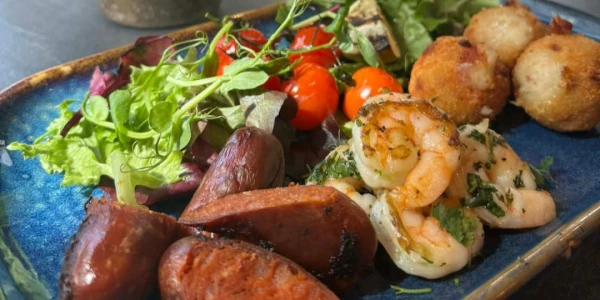The trio of starters is easy to share and includes pan-fried spiced chorizo, garlic prawns, and Serrano ham croquettes.