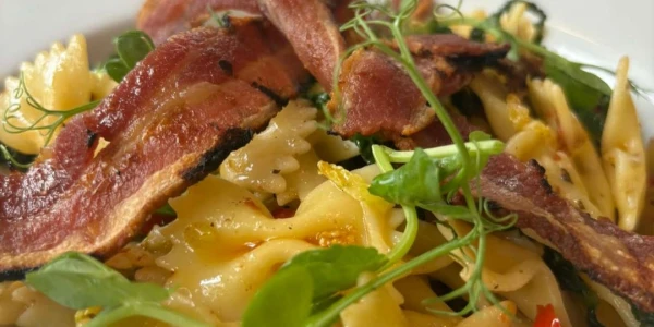 The warm farfalle pasta salad combines savoy cabbage, sundried tomatoes, crispy bacon, and a touch of chilli. It’s full of flavour but still light enough for warmer days.